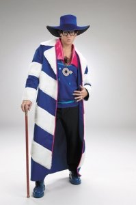 Includes: Blue twill long coat with white faux fur stripes and lapel and Hat.